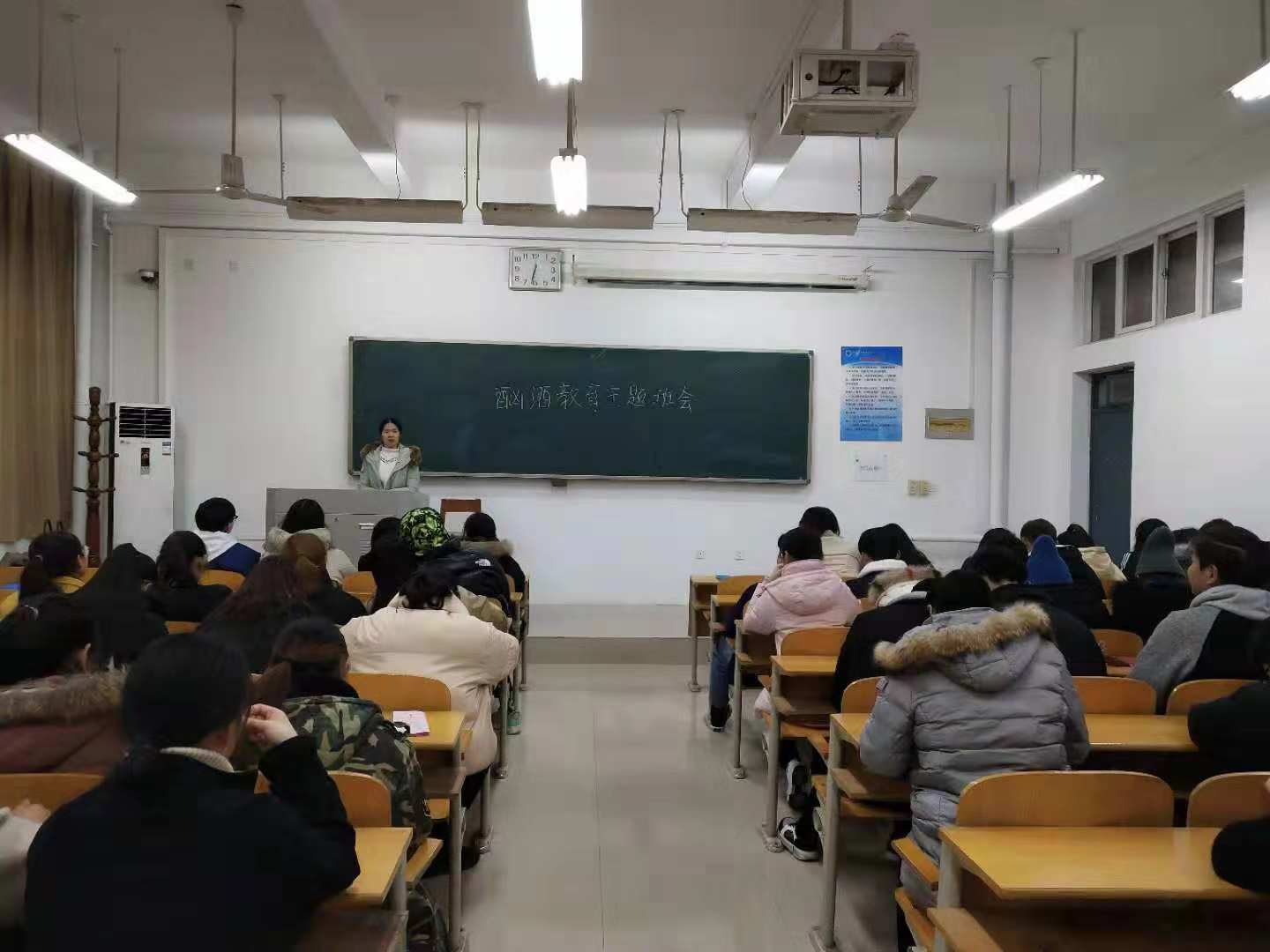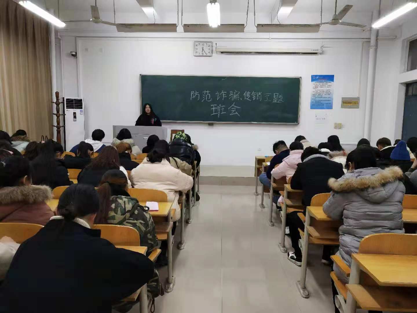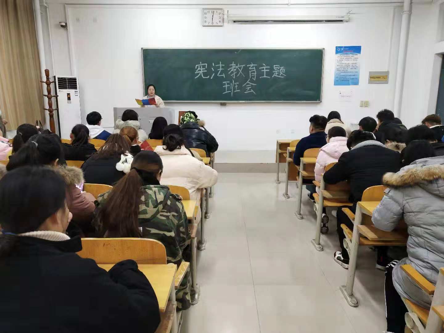 在12月10日、11日下午,2018级声乐专业72名员工先后在二号教学楼2108教室及yL23411永利集团官网B401教室,举行“防范网络就业陷阱及传销”、“宪法教育”、“防艾教育”“酗酒教育”系列班会。班会由辅导员杨赛玉老师主持。