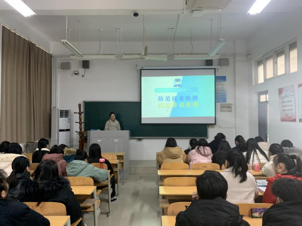 通过PPT,辅导员向同学们介绍了关于“借招聘骗取个人信息”、“扣留个人重要证件”、“只试用不聘用”等就业过程中常出现的8类求职陷阱,着重强调了大多数青年人的就业途径——网络就业的不安全因素,告知其应对方法,提醒同学们擦亮双眼,凡事三思后行。