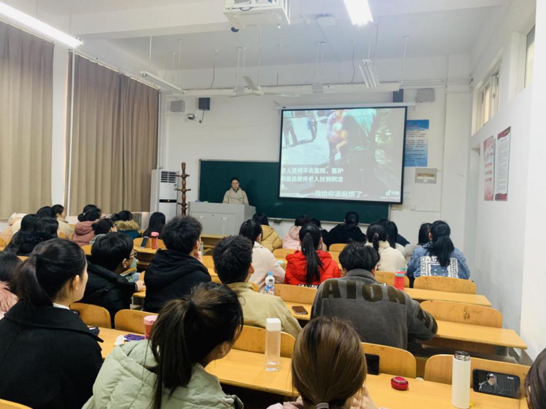辅导员老师通过PPT解读了每个价值观的含义,并与同学们交流关于国家发展、社会进步、人生理想等看法。通过观看“抢险救灾官兵跳伞”、“医者仁心”、“地铁车站温情一幕”、“老人摔倒讲诚信”等短视频,寻找其中所蕴含的核心价值观,实现共情。