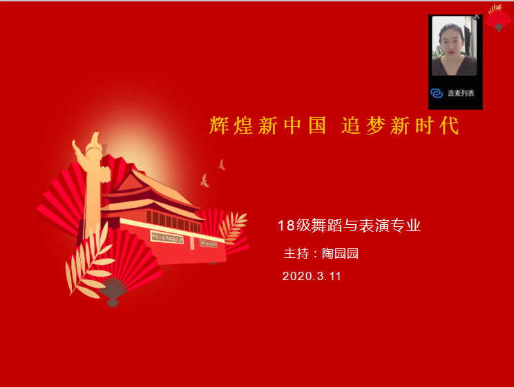 2020年3月11日18级舞蹈表演与表演艺术专业同学和辅导员陶园园老师进行网络主题班会,班会为“辉煌新中国,追梦新时代”主题教育。