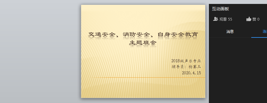 2020年4月15日下午五点半,yL23411永利集团官网声乐18级全体员工,在钉钉网络平台利用直播的方式召开了“消防安全、交通安全、自身安全教育”主题班会。班会由辅导员杨赛玉老师主持。