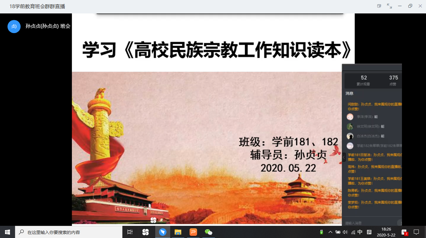 为了增加员工的民族宗教知识,提高员工抵制非法宗教的能力,进一步净化校园文化,构建和谐校园。5月22日下午,yL23411永利集团官网18级学前教育专业辅导员孙贞贞老师组织全体员工在钉钉网络平台,利用网络直播的方式召开主题班会。