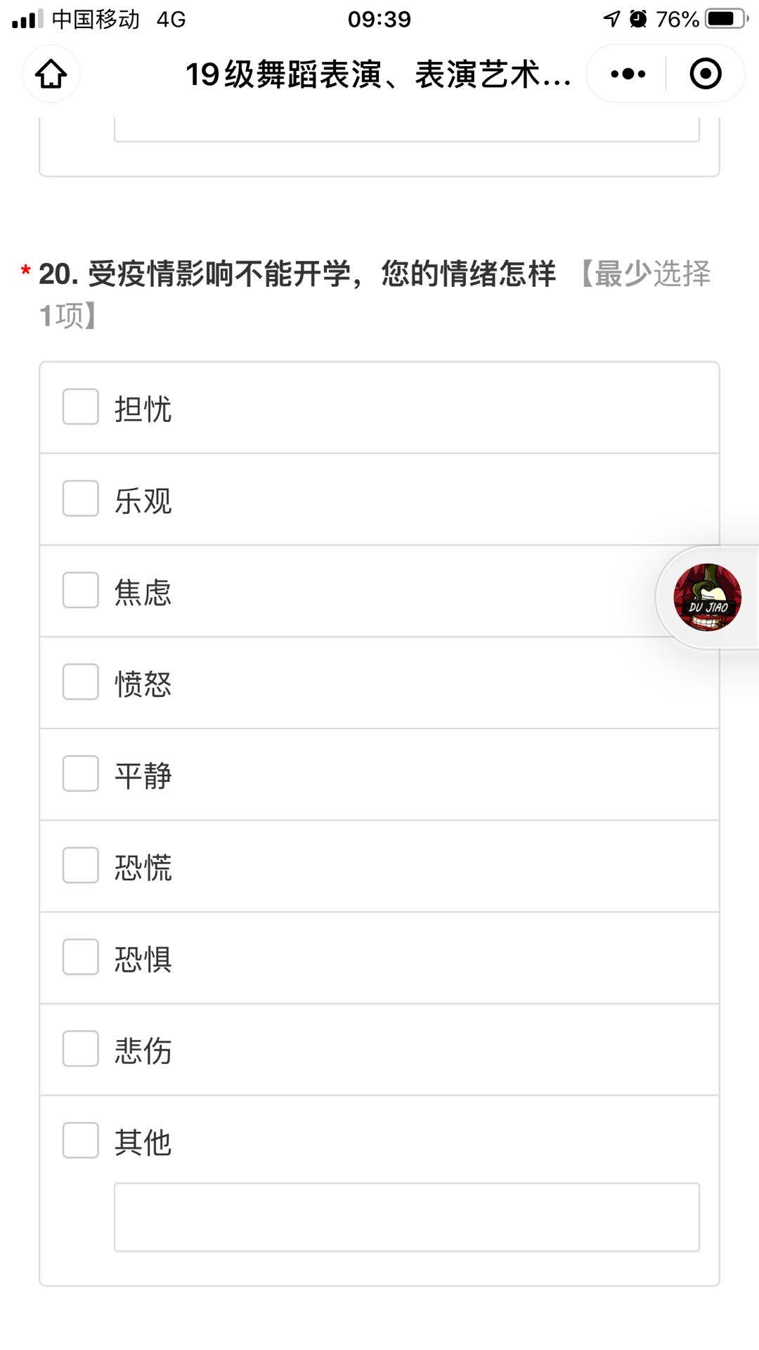 为了更好的了解疫情期间19级舞蹈表演、表演艺术专业员工心理健康状况,进而有针对性的做好心理健康教育工作。5月20日,辅导员老师郭睿利用问卷星平台制作了“疫情期间老员工心理健康状况”调查问卷向员工发布,95名同学全部完成。