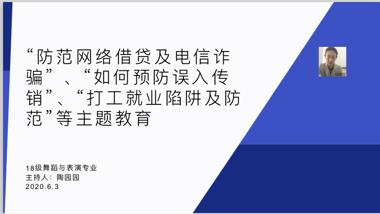 2020年6月3日下午,18级舞蹈表演与表演艺术专业同学,进行了网络班会,班会主题为“防范网络借贷及电信诈骗” 、“如何预防误入传销”、“打工就业陷阱及防范”及“珍爱生命预防溺水”等主题教育班会,班会由辅导员陶园园老师主持。