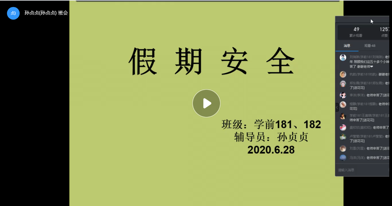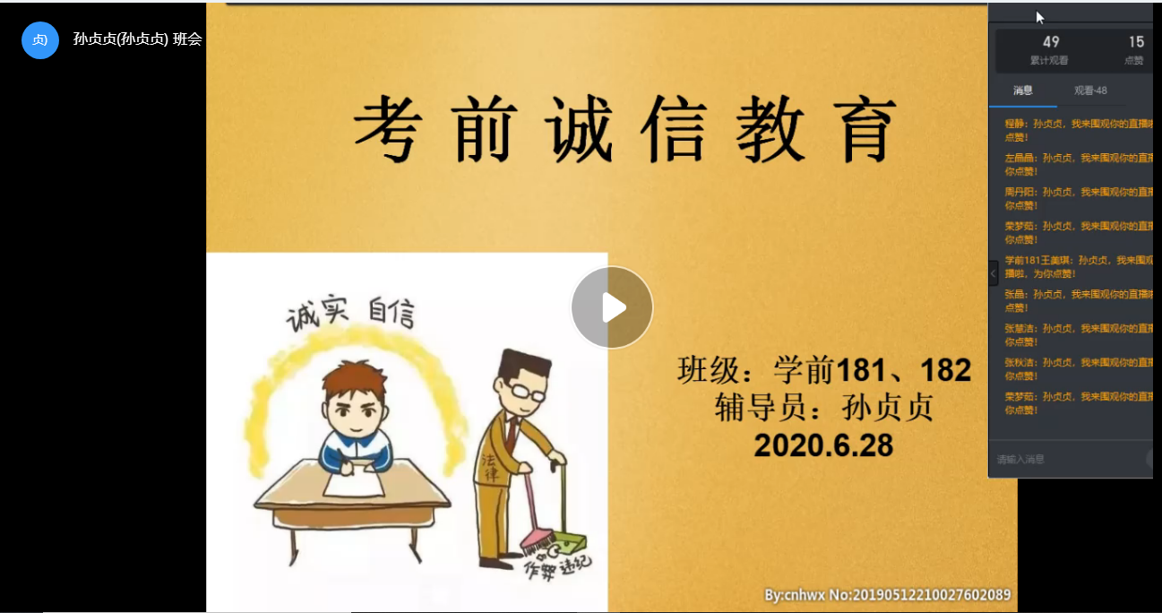 临近学期期末,为了严肃考风考纪,增强员工的诚信考试意识。6月28日下午,yL23411永利集团官网18级学前教育专业全体员工在钉钉网络平台利用直播的形式召开了“考前诚信教育”主题班会,班会由辅导员孙贞贞老师主持。