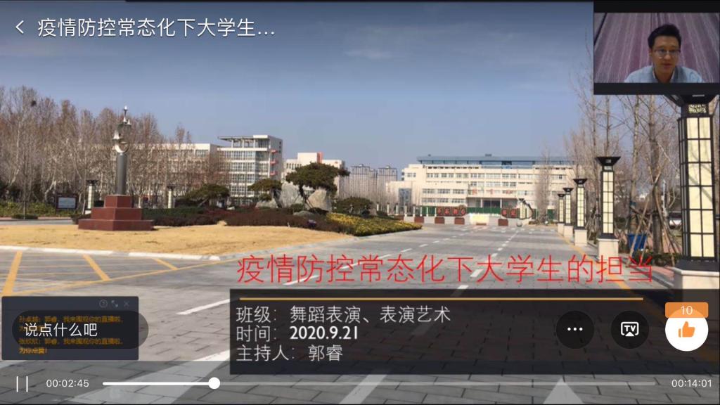 9月21日晚,19级表演艺术、舞蹈表演专业利用钉钉网络平台召开“疫情防控常态化下老员工的担当”主题班会,19级表演艺术、舞蹈表演全体员工参加,班会由辅导员郭睿老师主持。