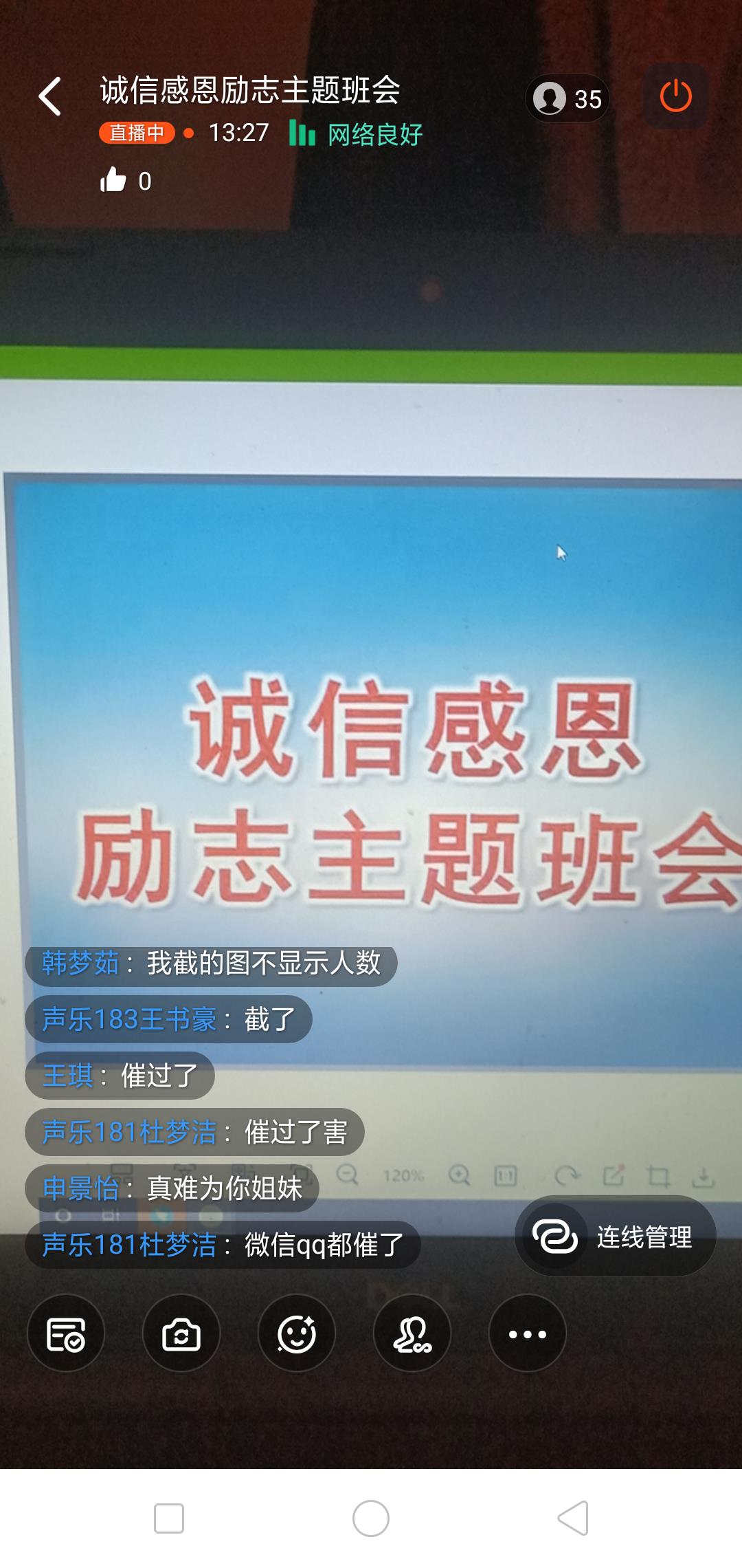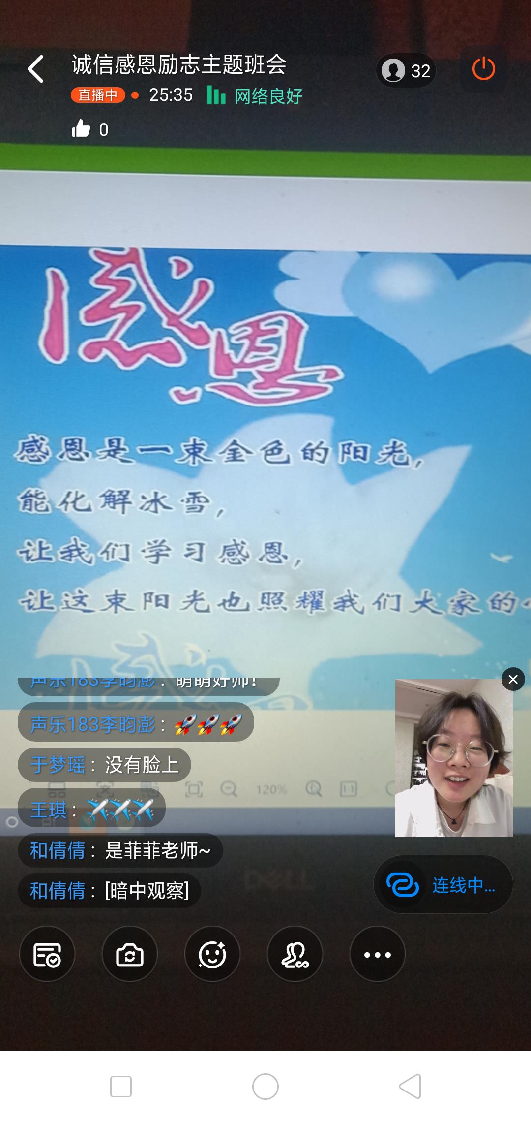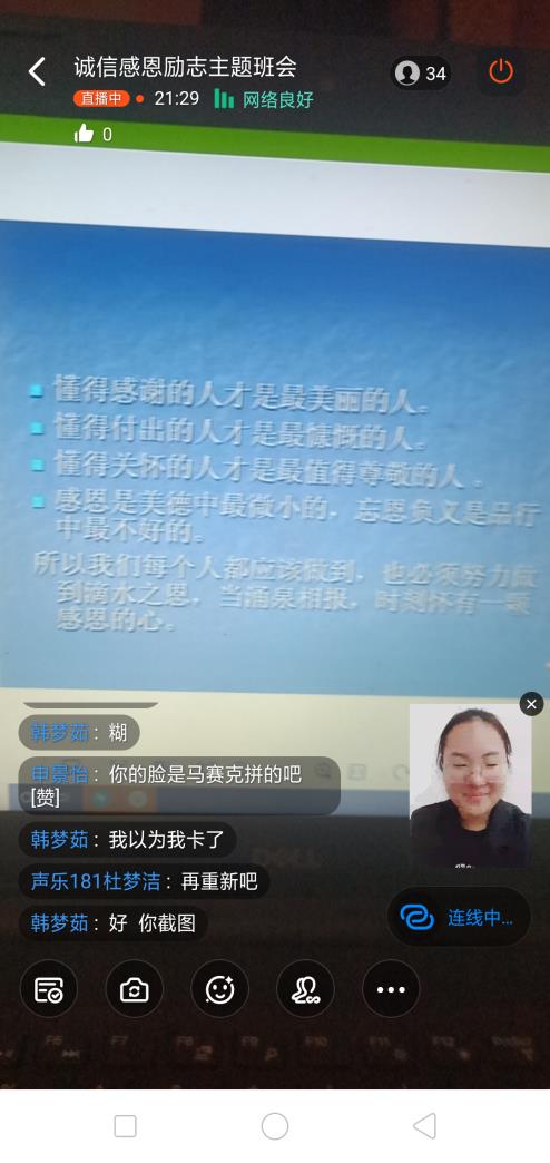 次班会通过照片展示、事例讲述、互动连麦等方式开展,通过本次班会,同学们再次认识到诚信是人类社会普遍的道德要求,是个人立身处世的基本规范,是社会存续发展的重要基石;感恩源自于细节,要在生活点滴中学会感恩,并将其付诸于行动;而励志成才即是老员工面对未来生活、事业甚至挫折时所必备的重要精神。