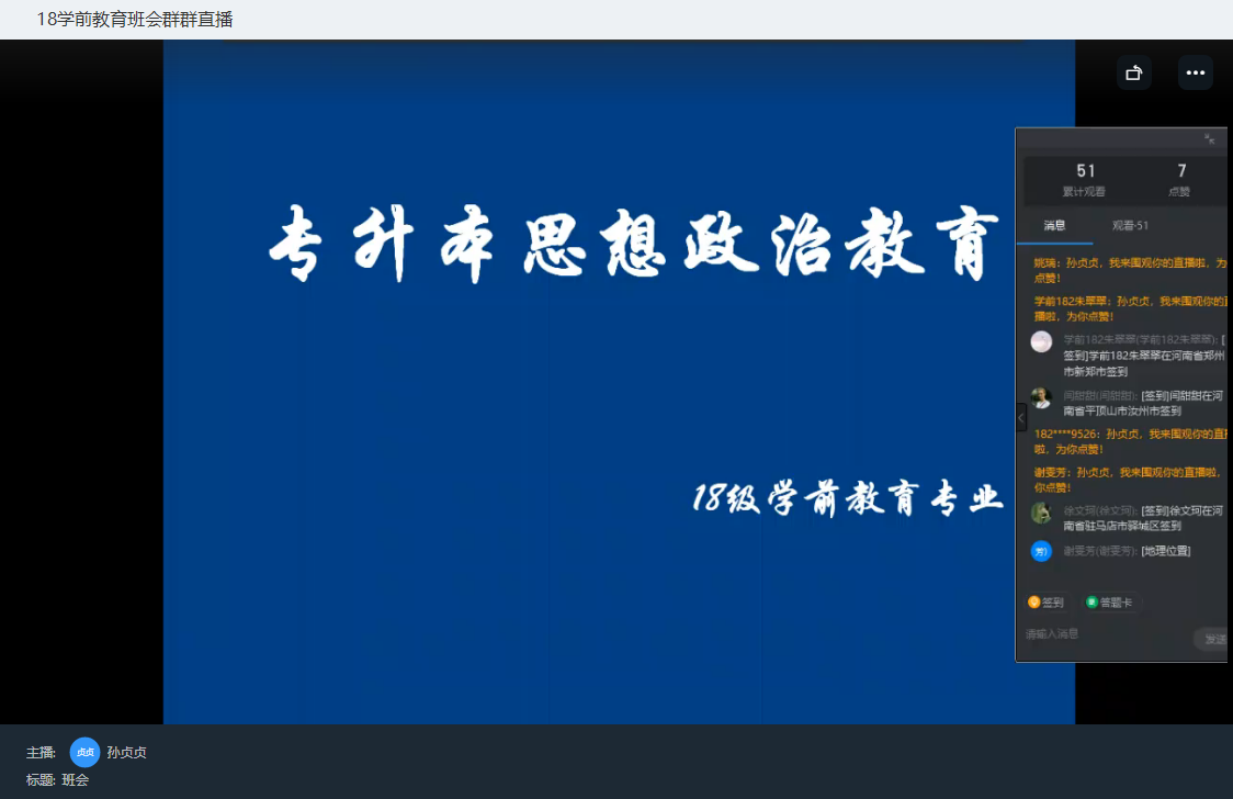 5月16日晚,辅导员孙贞贞老师召集18级学前教育专业全体员工在钉钉网络平台,利用网络直播的形式开展了“专升本思想政治教育”和“奋斗百年路,启航新征程”主题班会。