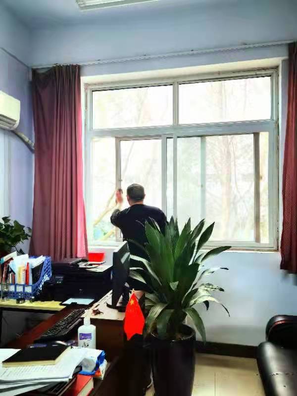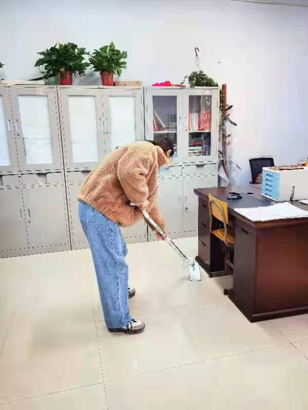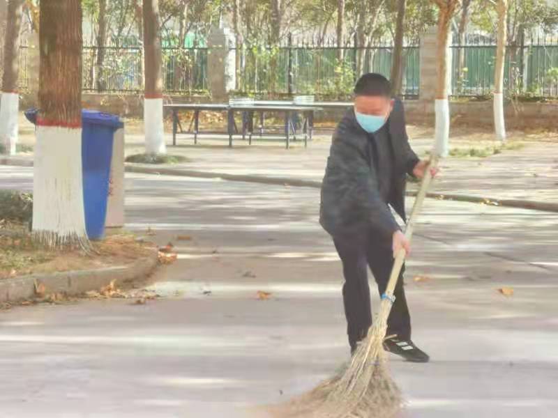 老师们在教学楼周边,清扫树叶,清除建筑垃圾,摆放防汛沙袋,打扫实训室、教室等区域,共同营造干净有序的教学办公环境。