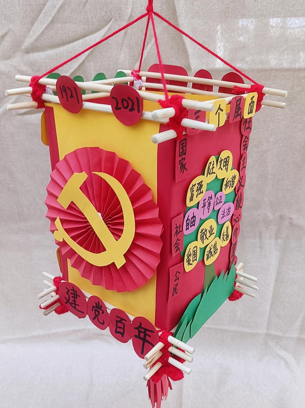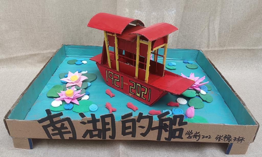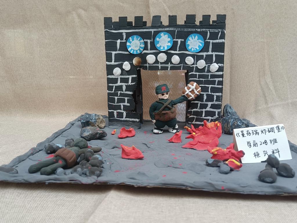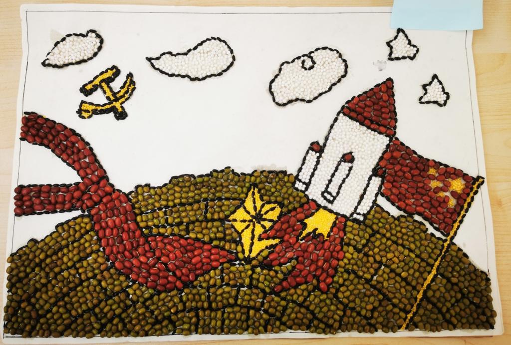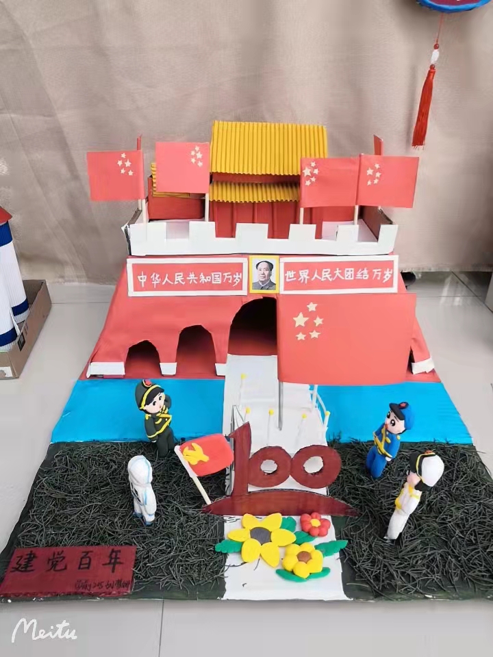 本次环创作品在指导教师孙贞贞的统筹安排下,同学们充分利用废旧报纸、纸盒、枯树枝、树叶、卡纸、轻粘土等材料,精心构思,巧妙设计,紧扣建党百年时代主题,如废旧纸盒做出的天安门城楼、中国航天模型、董存瑞炸碉堡……用废旧报纸加轻粘土做成的长城、红船、飞夺泸定桥、井冈山会议……另外还有以新冠病毒、白衣天使为元素的抗疫儿童立体绘本、粮食贴画、纽扣贴画……用飘落的银杏树叶做成的献礼建党百年花束……可谓是内容丰富、主题鲜明、形式新颖、惟妙惟肖、独具匠心。