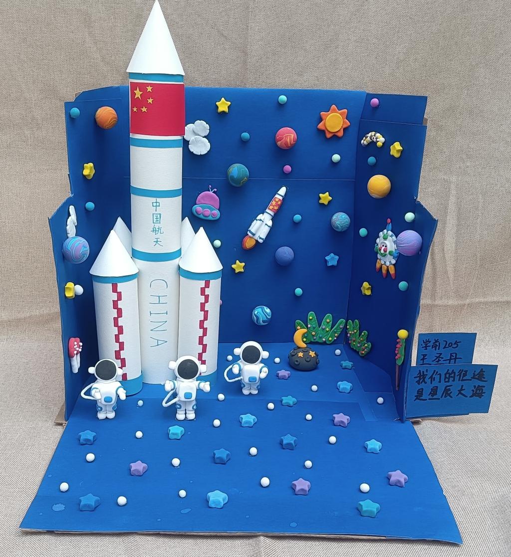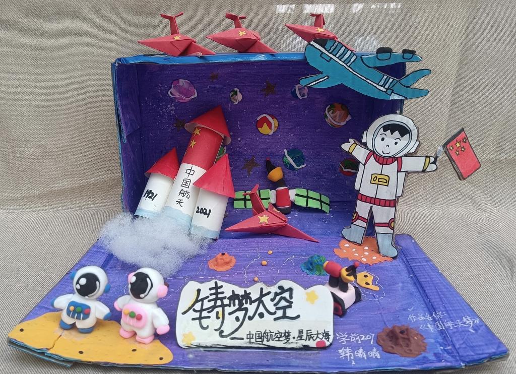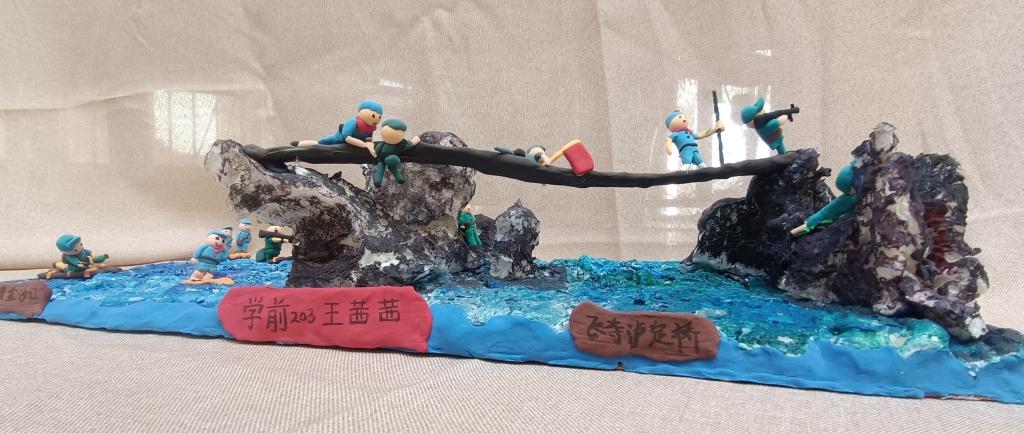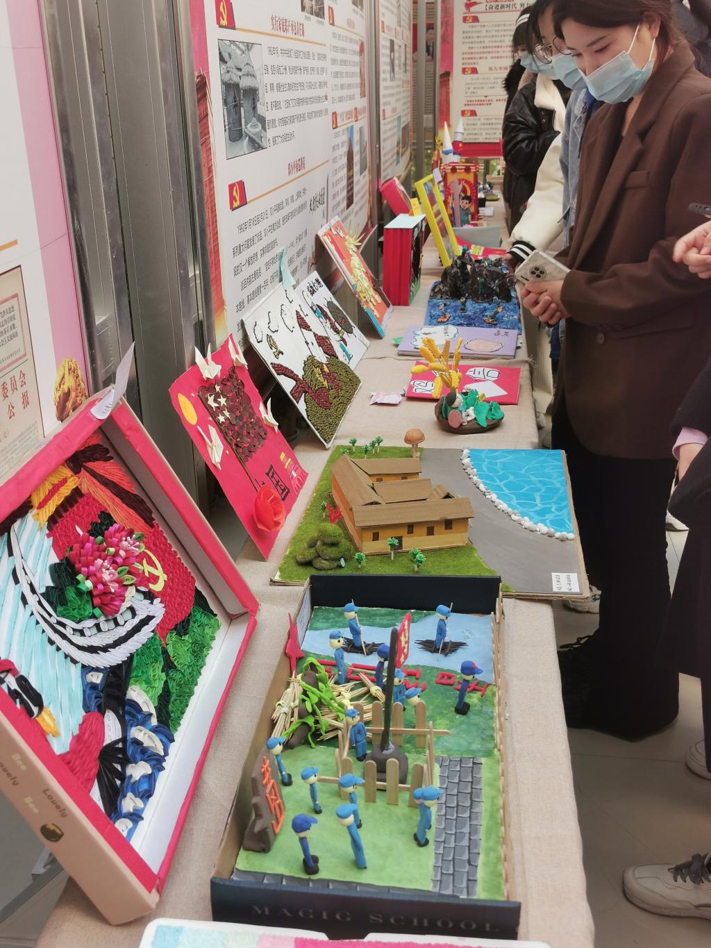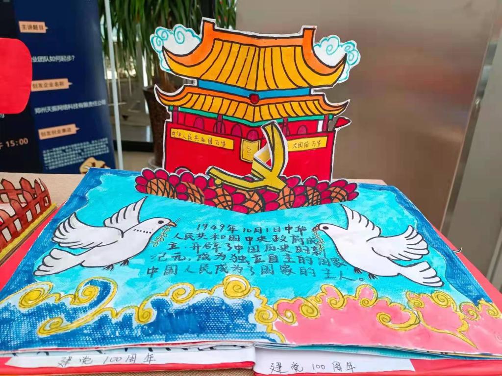 本次环创作品在指导教师孙贞贞的统筹安排下,同学们充分利用废旧报纸、纸盒、枯树枝、树叶、卡纸、轻粘土等材料,精心构思,巧妙设计,紧扣建党百年时代主题,如废旧纸盒做出的天安门城楼、中国航天模型、董存瑞炸碉堡……用废旧报纸加轻粘土做成的长城、红船、飞夺泸定桥、井冈山会议……另外还有以新冠病毒、白衣天使为元素的抗疫儿童立体绘本、粮食贴画、纽扣贴画……用飘落的银杏树叶做成的献礼建党百年花束……可谓是内容丰富、主题鲜明、形式新颖、惟妙惟肖、独具匠心。