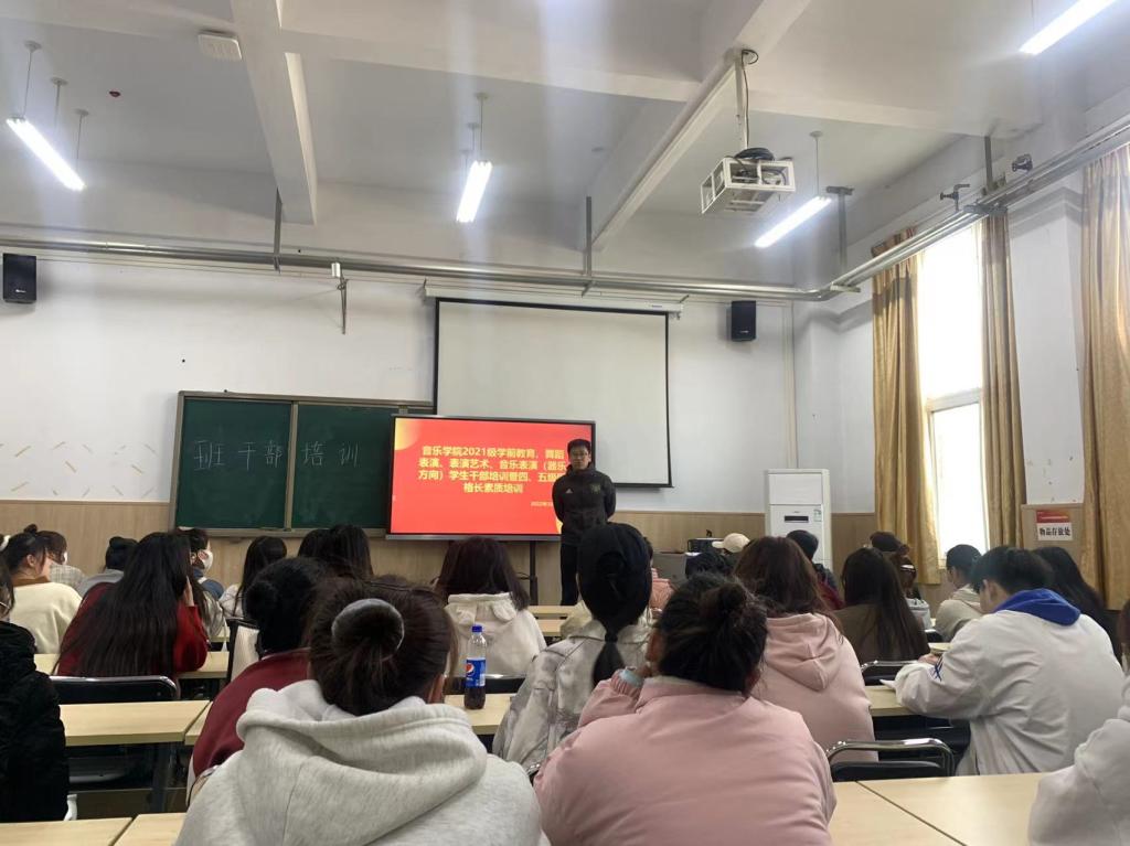 为了更好落实网格化管理,根据日常员工工作需要和员工特点,结合学工部下发的员工干部培训大纲,2021级学前教育、舞蹈表演、表演艺术、音乐表演(器乐方向)专业于3月7日中午在音乐楼B101教室召开了员工干部培训暨四、五级网格长素质培训活动。全体班委和宿舍长参加,培训由辅导员郭睿老师主持。