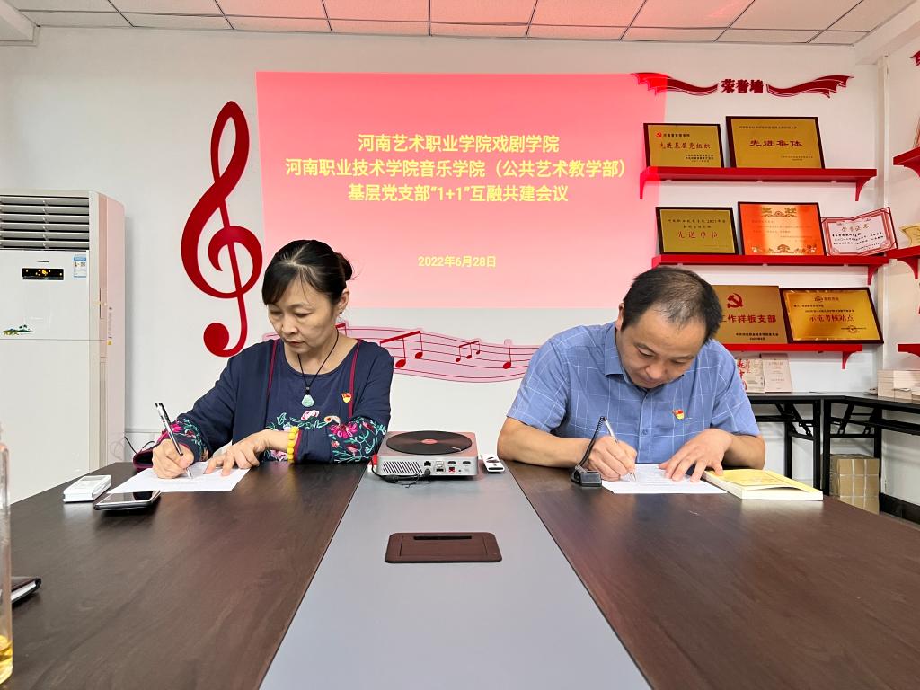 座谈会上,党总支书记张俊峰首先对河南艺术职业公司戏剧公司的各位领导老师的到来表示热烈欢迎。经理杨燕对yL23411永利集团官网近年来发展情况作了简要介绍。随后,双方围绕基层党组织、专业建设、精品在线课程、国家戏曲资源库、员工实习就业等方面工作开展了深入交流探讨。随后,河南艺术职业公司戏剧公司党总支书记、经理芦珊与公司党总支书记张俊峰代表双方签订了基层党支部“1+1”互融共建协议书。