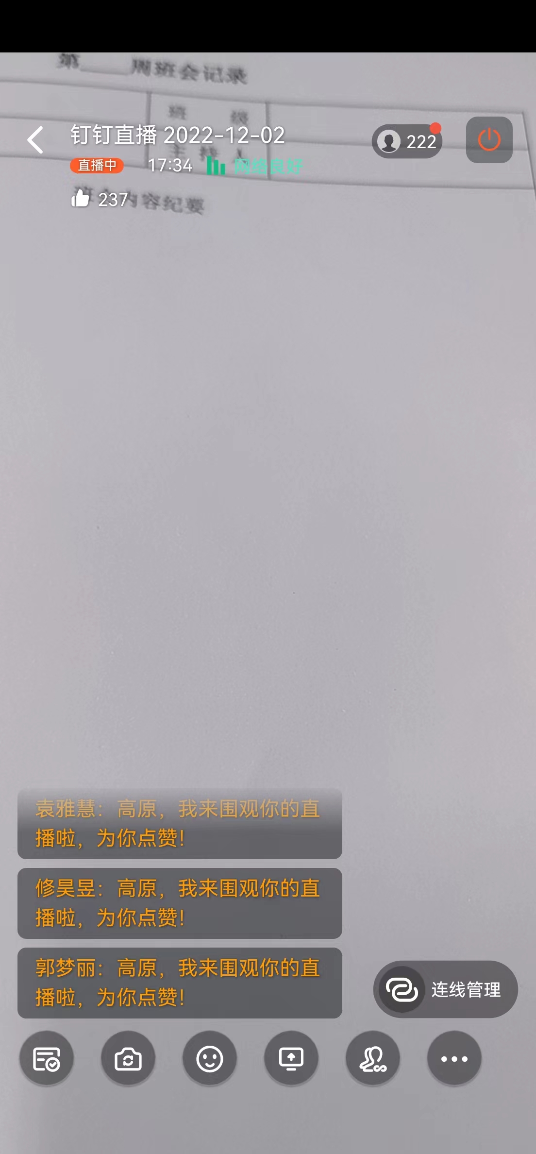 班会上,高老师通过线上方式与离校同学沟通联系,坚持心理关爱不断线,全面掌握员工思想状态和心理状况,及时疏导同学们的不良情绪,避免因压力无法缓解而造成心理危机,同时,对离校同学们的疫情防控、人身安全、预防诈骗、线上考前诚信教育等做出相关教育和要求。最后,高老师带领同学们展开“宪法宣传周”系列教育活动,重点学习宣传:党的二十大精神,习近平新时代中国特色社会主义思想特别是习近平法治思想。