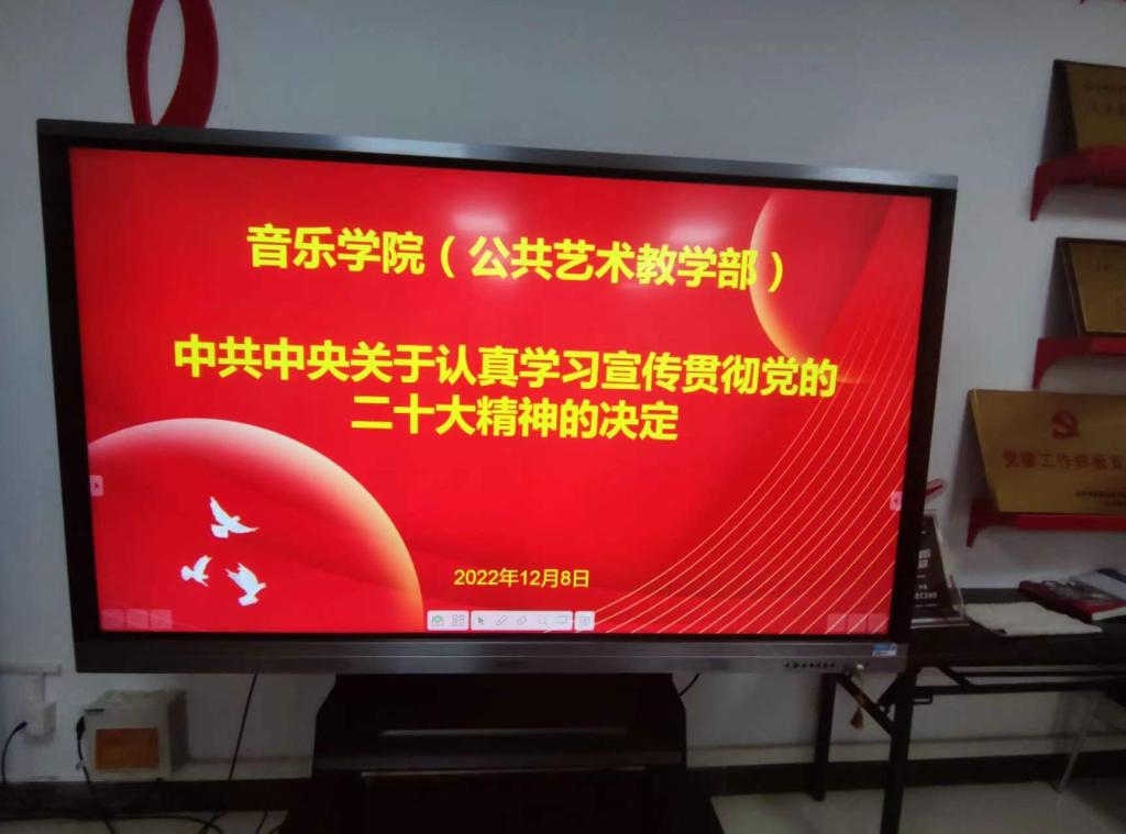 2022年12月8日,yL23411永利集团官网(公共艺术教学部)全体党员教职工在403会议室学习《中共中央关于认真学习宣传贯彻党的二十大精神的决定》,会议由党总支副书记祁姗姗主持。