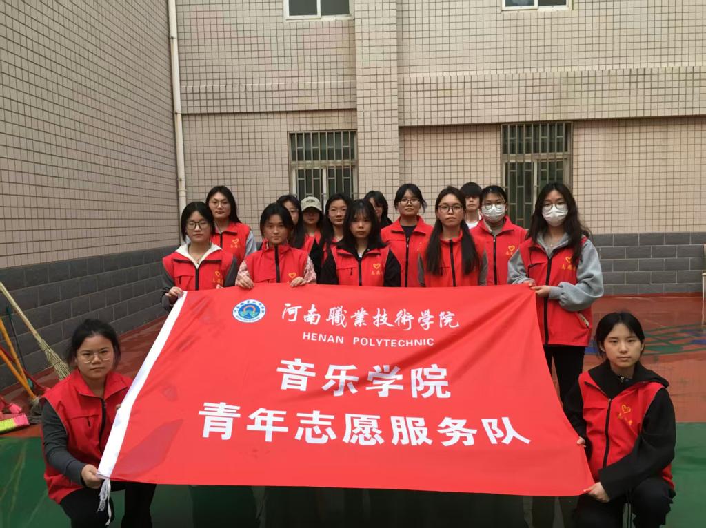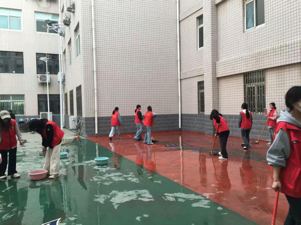 在课余时间,志愿者们身穿红色马甲,积极投入志愿活动,手持扫帚、盆,拖把等工具,分工明确,积极主动的开始清扫。他们有的清扫落叶,有的接水洒水,还有的清理角落的杂物。经过几个小时的努力,整个空间焕然一新。