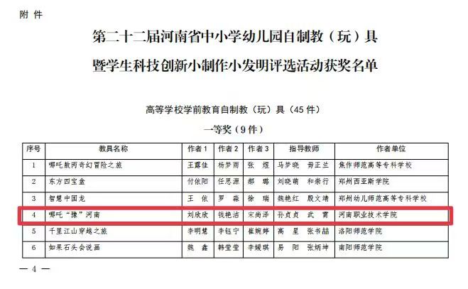 近日,由河南省教育厅主办的第二十二届河南省中小学幼儿园自制教(玩)具评选活动落下帷幕。公司学前教育专业员工团队凭借其精心打造的作品《哪吒“豫”河南》,在全省45件高等公司学前教育自制教(玩)具参赛作品中脱颖而出,荣获一等奖,为公司赢得了荣誉,也为学前教育专业的发展增添了浓墨重彩的一笔。
