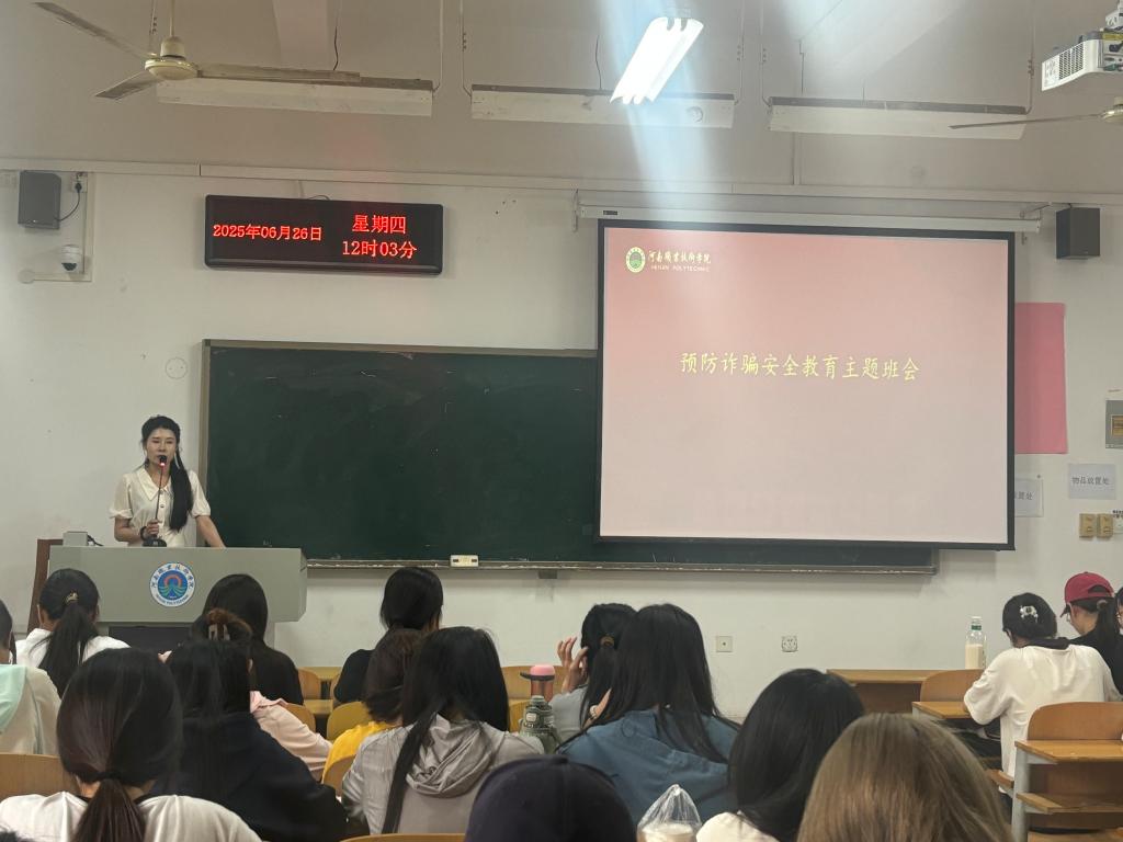 在防范网络借贷及电信诈骗主题班会中,辅导员通过真实案例深入剖析,向同学们展示了网络借贷和电信诈骗的常见手段、作案方式以及防范要点。提醒同学们务必保持警惕,理性消费,不轻信陌生来电和信息,保护好个人隐私和财务安全,遇到可疑情况及时与公司、家人沟通或报警。告诫同学们在求职和社交过程中要谨慎选择,避免被高薪诱惑或虚假宣传误导,提高辨别能力,远离传销陷阱,树立正确的择业观和价值观。