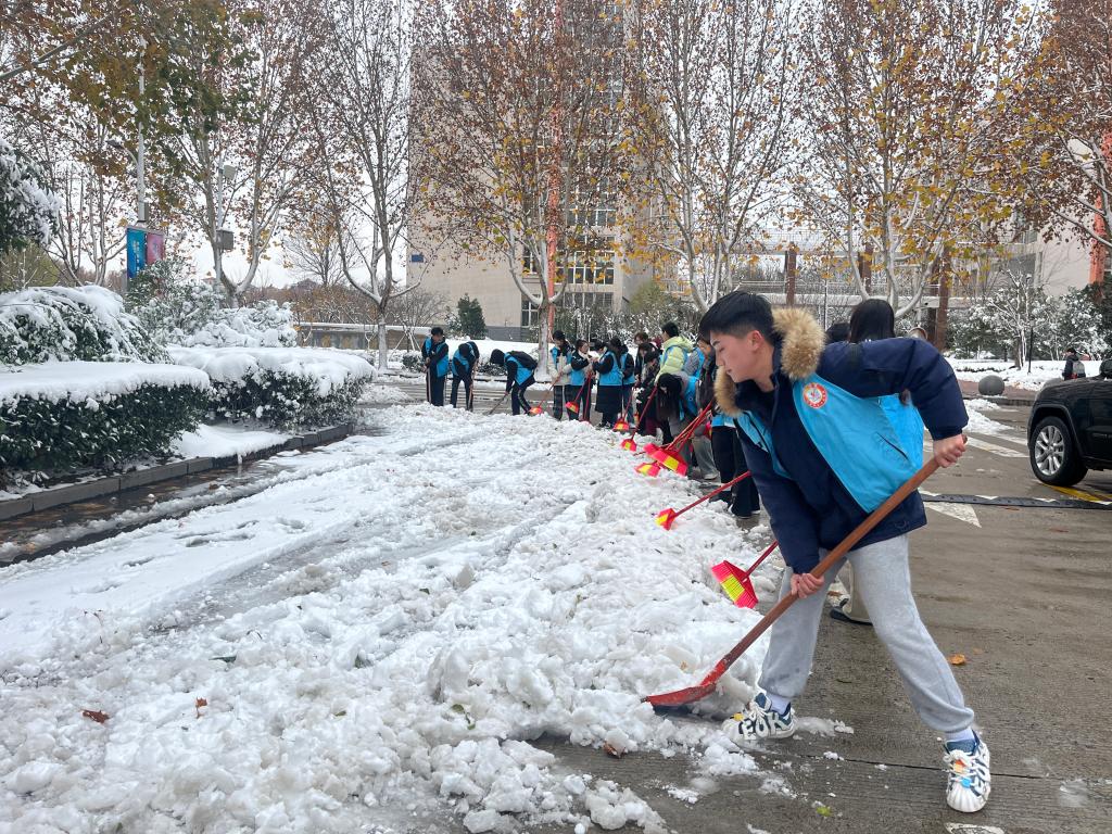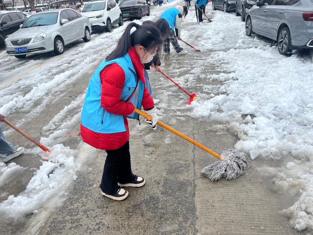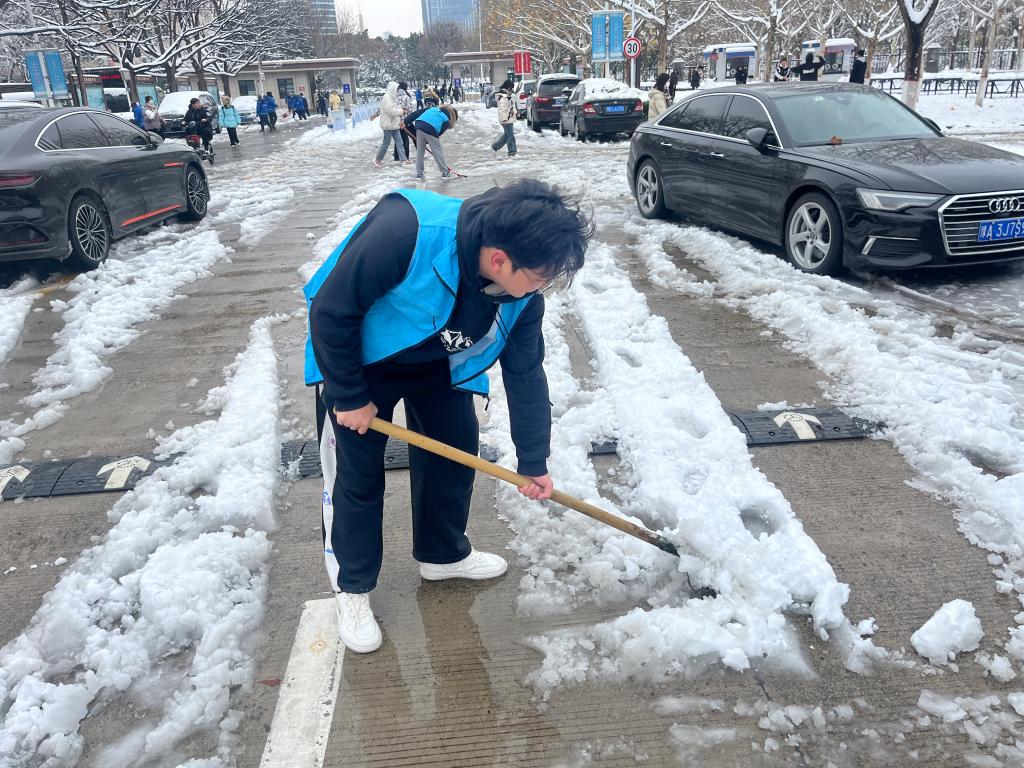 活动现场,青年志愿者们不惧冰冻寒冷、浴“雪”奋战,手拿铁锹、扫把等工具,相互配合、轮流作业,开展除雪清扫工作,虽然寒风凌冽、寒气逼人,但大家依旧热情高涨地投入到清理工作中,用热情融化着冰雪,也用行动温暖着校园。