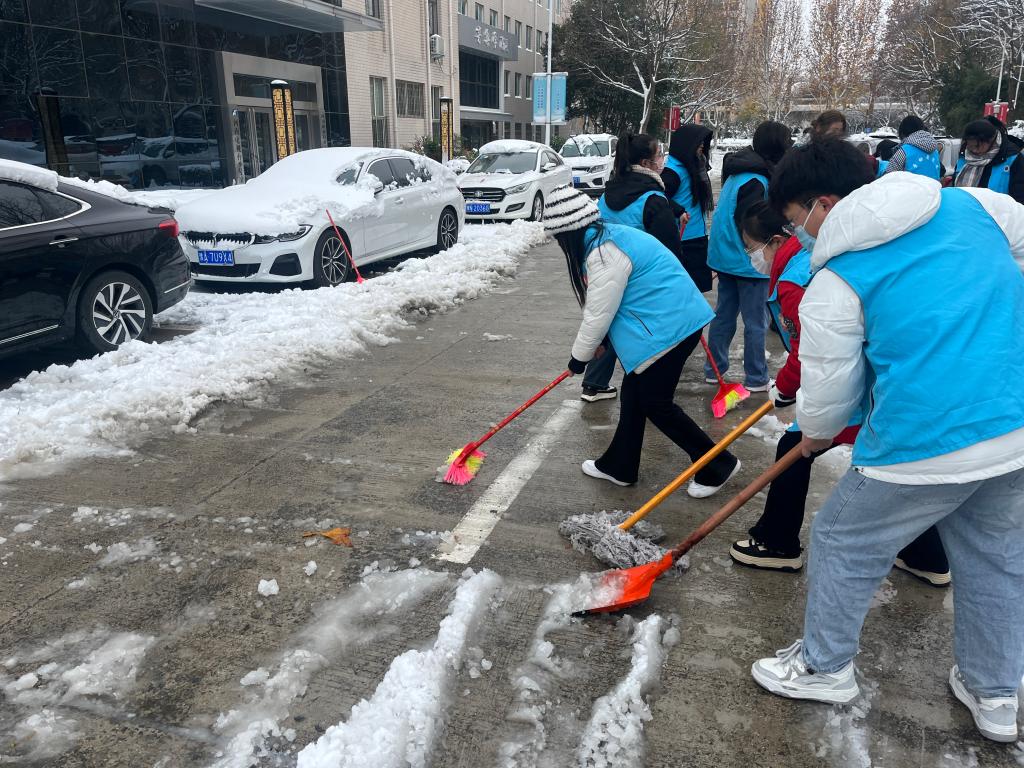 白雪穿庭树,银装裹校园。12月10日晚,一场纷纷扬扬的大雪飘然而至,大雪后的河职校园美不胜收。大雪在给同学们带来惊喜的同时,也给交通和出行带来极大不便,校内道路上出现明显积雪,部分路段出现了道路结冰现象。为确保校内道路通畅,保证师生安全出行,12月11日中午,yL23411永利集团官网员工党支部、团总支组织员工党员、预备党员、员工会工作人员、各团支部青年团员40余人组成志愿服务队,沿知行路到公司东南门开展铲雪除冰志愿服务主题党日活动。
