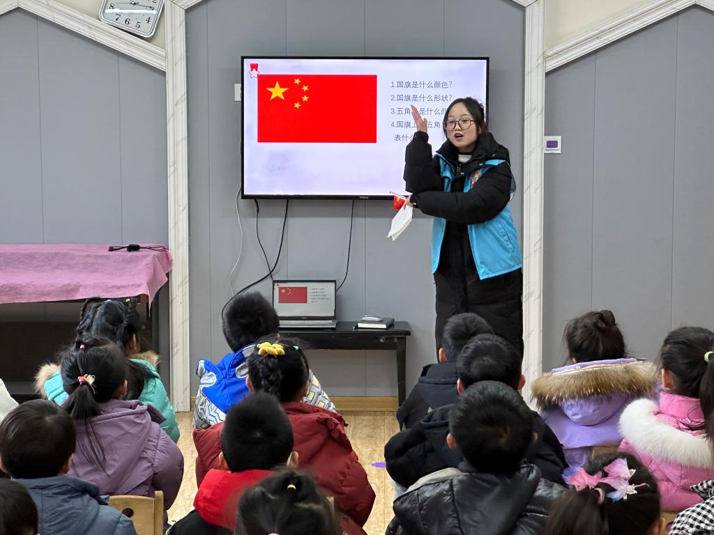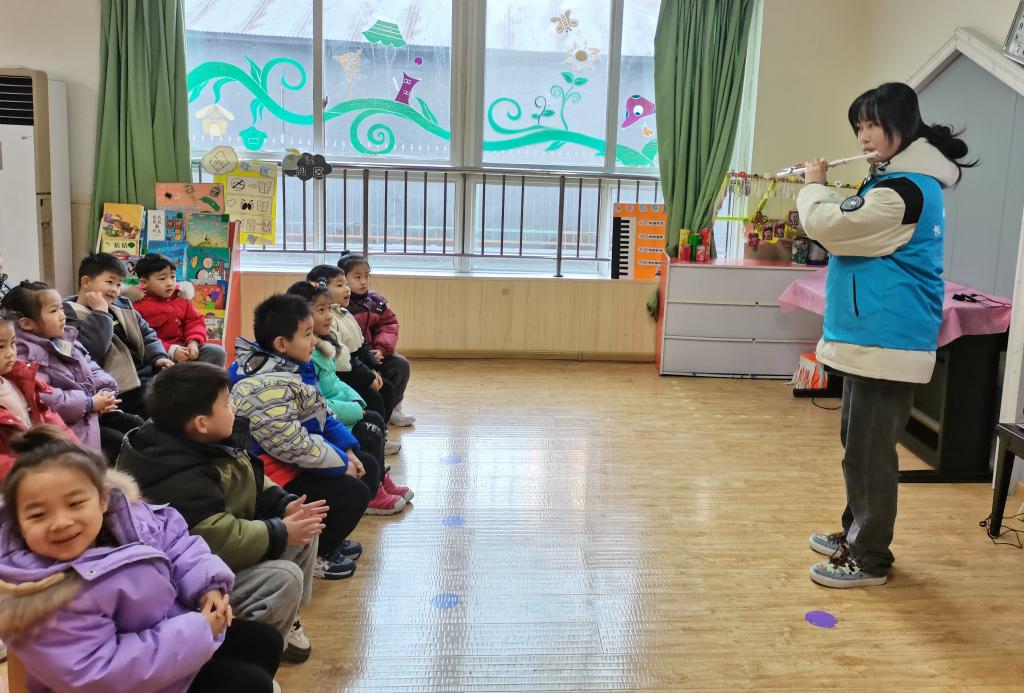 活动开始,器乐专业志愿者给小朋友们介绍乐器“长笛”的发源和构造,演奏曲目《歌唱祖国》。随后学前教育专业志愿者演唱歌曲《祖国祖国我们爱你》,带领小朋友一起观看升国旗的视频,引导小朋友了认识国旗、学唱国歌,然后教授小朋友们一起练习手势舞《我是中国娃》。最后在游戏《传声筒》的欢声笑语中结束了本次活动。活动结束,小朋友们围绕着志愿者久久不愿离去,希望哥哥姐姐们常来幼儿园跟他们一起游戏。