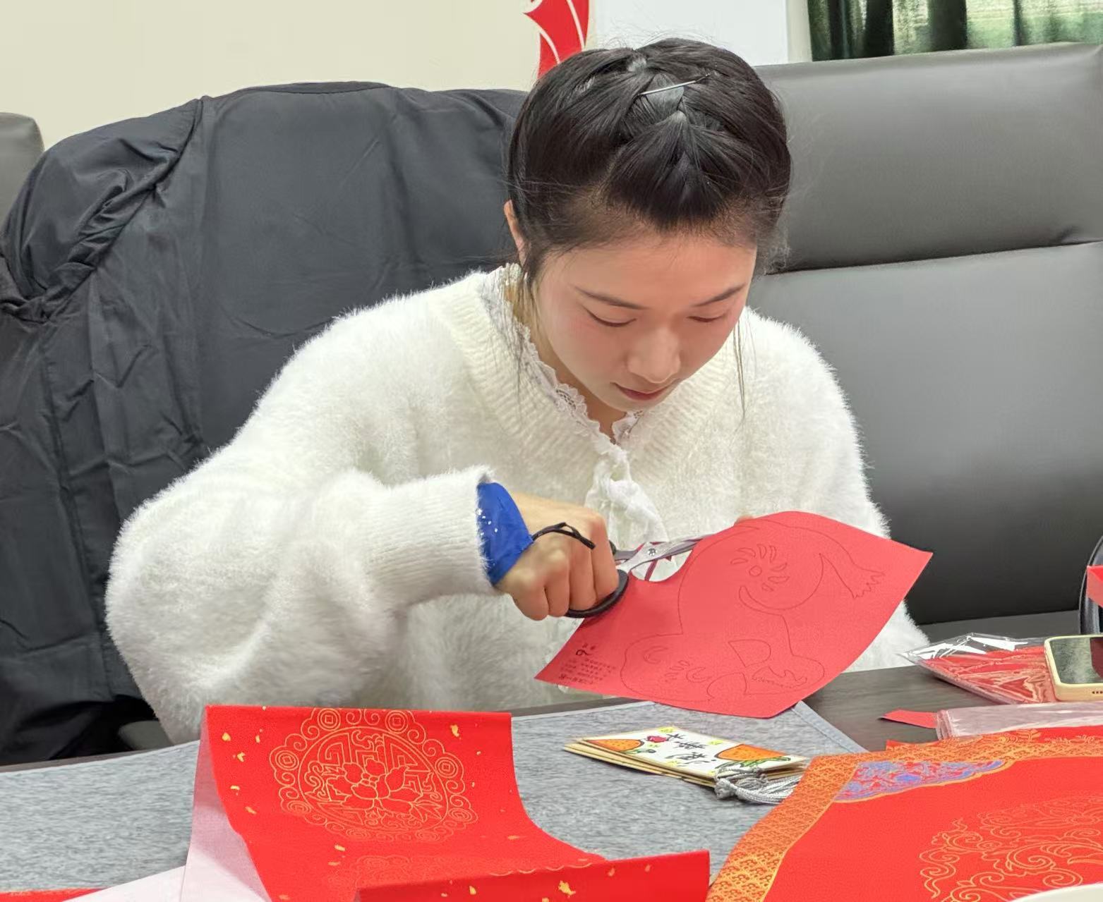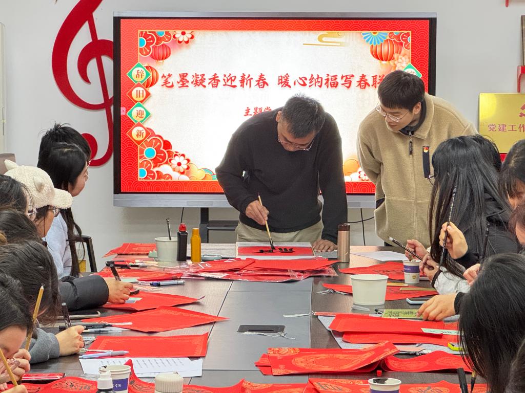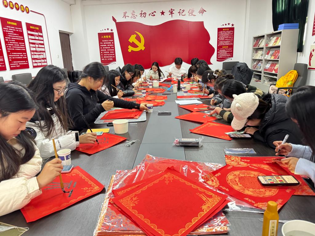 活动现场,气氛热烈。党员教师们和员工们热情高涨,大家手握毛笔,挥毫泼墨,时而笔力劲挺、大气磅礴,时而笔酣墨饱、丰厚雍容。一副副火红吉祥的春联,不仅展示了书法魅力、课堂成果,更书写出了新时代新青年对美好生活的中国梦的向往。另一边,同学们还在紧锣密鼓地开展着手工剪纸、国风书签的制作,大家运用自己的独特创意和视角,有的以古典诗词为主题,有的以传统纹饰为灵感,还有的结合了现代元素和个人创意,精心设计剪纸形状、书签版面和内容。一张张红纸在同志们的巧手下,被赋予了新的生命,变成了寓意深远的剪纸艺术作品,传递了对党和国家的无限热爱与忠诚;一个个独特的书签,成为了连接书籍与读者、读者与读者之间的纽带。