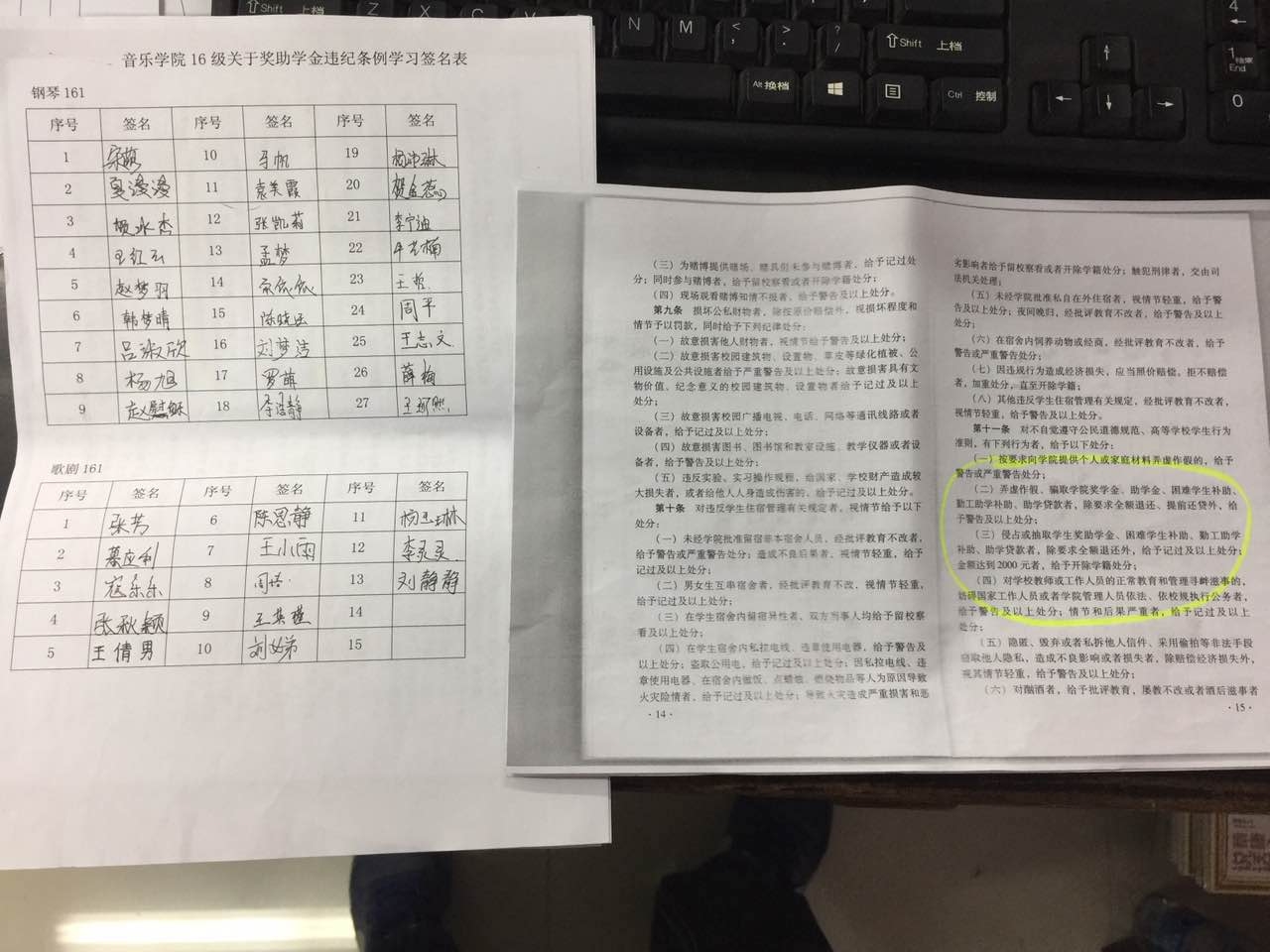在本次班会的最后,郭睿老师又带领同学们共同学习了《yL23411永利集团官网员工违纪处分实施细则》第二章第十一条第三款关于侵占或抽取员工奖助学金、困难补助、勤工助学金、助学贷款的严肃处理规定,要求每个员工签名确认,给所有员工敲响了警钟,起到了良好的效果。