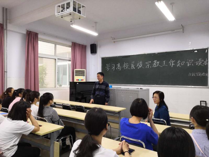 此次班会的主题为“学习《高校民族宗教知识读本》”,班会上,首先由辅导员孙老师带领同学们一起学习我国的民族政策、民族关系、宗教的本质、宗教与邪教的区别和高校如何抵御校园渗透等内容。接下来由班长组织大家开展民族宗教知识竞答活动,同学们积极抢答,气氛热烈。