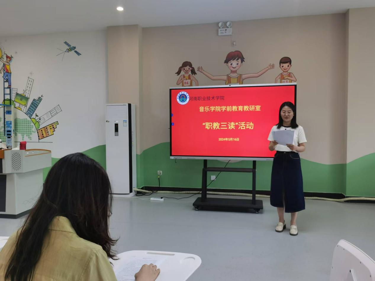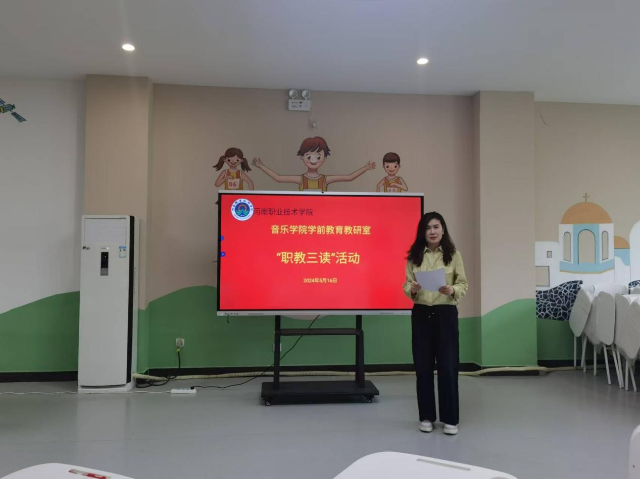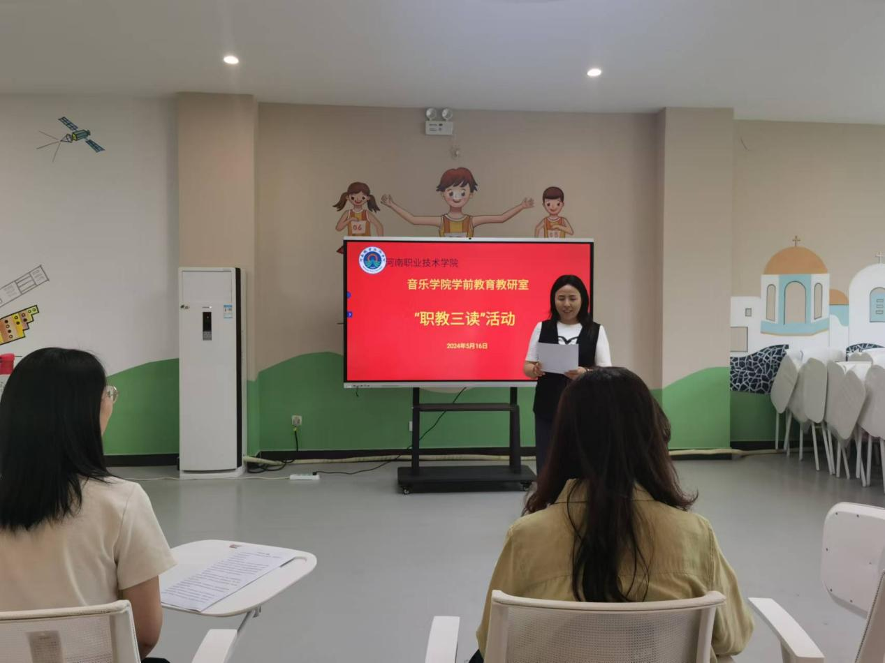 根据《yL23411永利集团官网第十三届读书节系列活动工作方案》(豫职院〔2024〕39号)总体安排,在yL23411永利集团官网统一部署下,学前教育教研室于2024年5月16日在学前教育实训室(烹饪楼303)成功举办了“职教三读”活动。本次活动以“深化理解、共享智慧、创新实践”为主题,旨在通过深入阅读、交流分享和实践应用,促进学前教育教研工作的持续发展。学前教研室全体教师参加了本次活动。