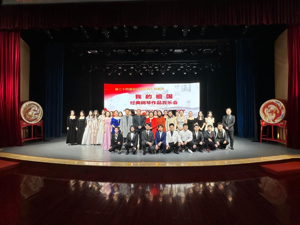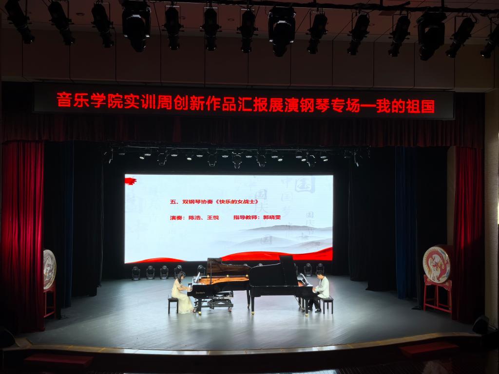 本次钢琴专场展演的主题是“我的祖国”,精彩的表演为大家展开了中国钢琴艺术的画卷,选曲涵盖中国民族风格作品、现代风格作品、红色经典作品等,演奏形式有独奏、重奏和协奏,作品风格多样,内容精彩纷呈。以传承中国民族音乐文化为主旨,钢琴教研室专门排演了多首民族风格浓郁、专业水平较高的中国钢琴作品,如《翻身的日子》、《春舞》、《快乐的女战士》、《我的祖国》等。本次演出是钢琴教研室实训音乐周作品排练的成果汇报,也是钢琴专业教学水平的一次集中展现。