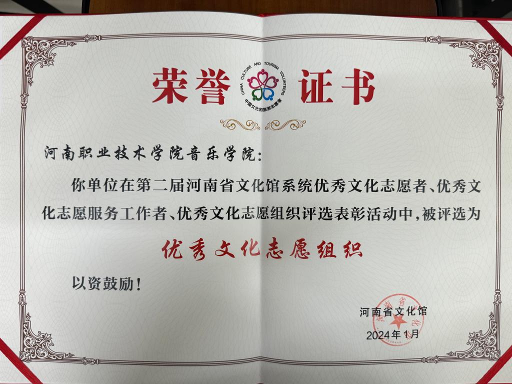 近日,河南省文化馆公布了第二届河南省优秀文化志愿者、优秀文化志愿组织评选活动先进典型名单。公司被评为优秀志愿服务组织,11名青年志愿者被评为优秀文化志愿者荣誉称号。