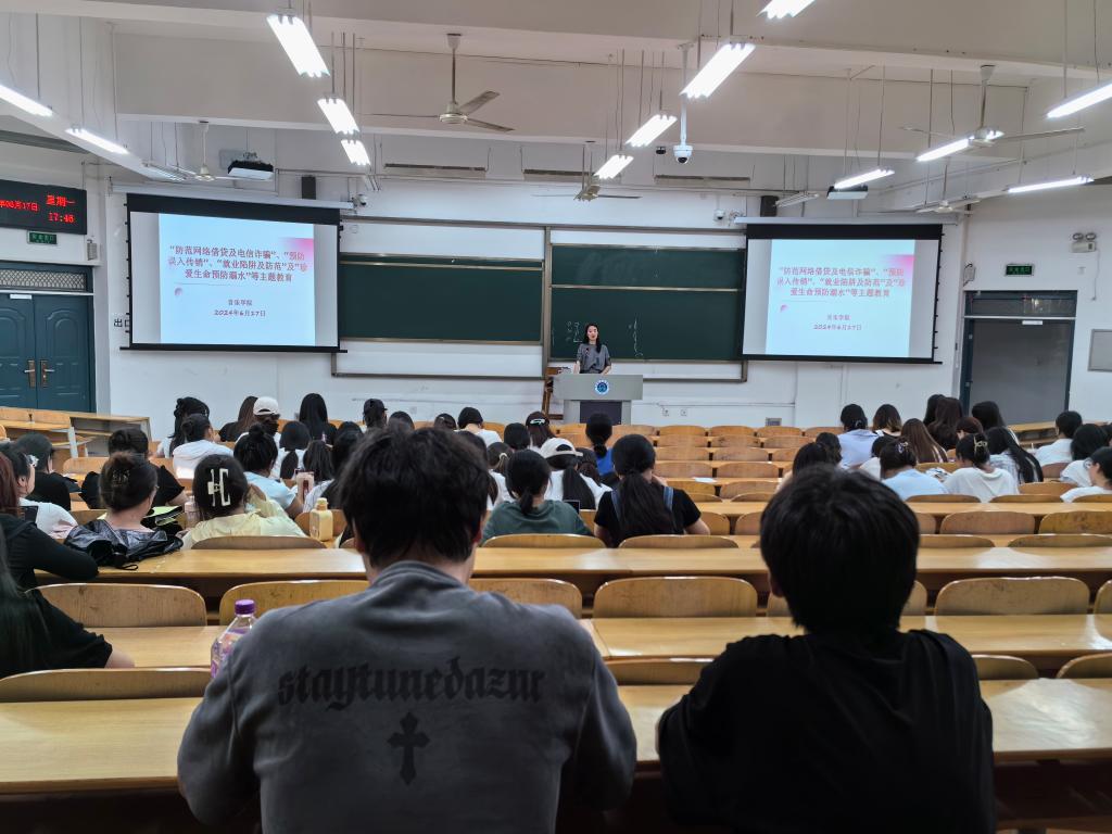 6月17日下午,yL23411永利集团官网“防范网络借贷及电信诈骗”、“预防误入传销”、“就业陷阱及防范”及“珍爱生命预防溺水”等主题班会在明理楼1104教室召开,2022级学前教育、舞蹈表演、表演艺术专业和音乐表演专业钢琴、器乐方向300余名员工参加班会,班会由辅导员老师高原主持。