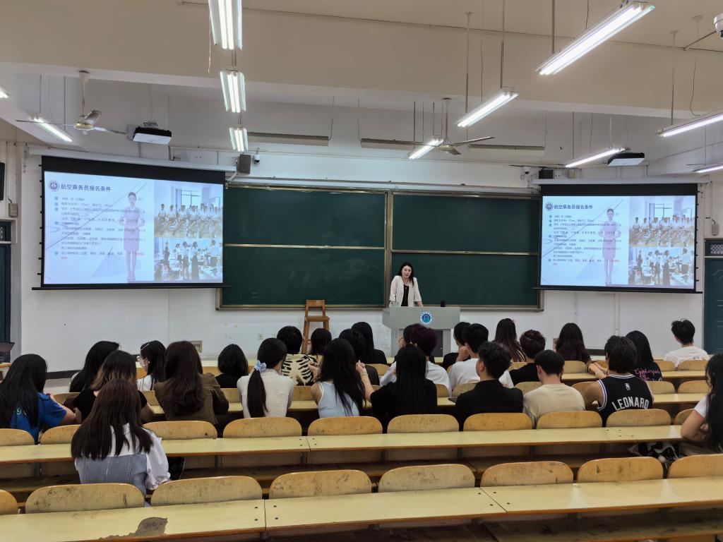 本次招聘会邀请了河南航投航空培训中心有限公司和濮阳市明英杂技艺术文化传播有限公司两家企业。招聘会上,用人单位以PPT形式热情细心地向同学们介绍招聘需求、工作环境、发展前景及薪资福利等情况。参会员工准备充分,携带着简历,积极与招聘人员进行交流。