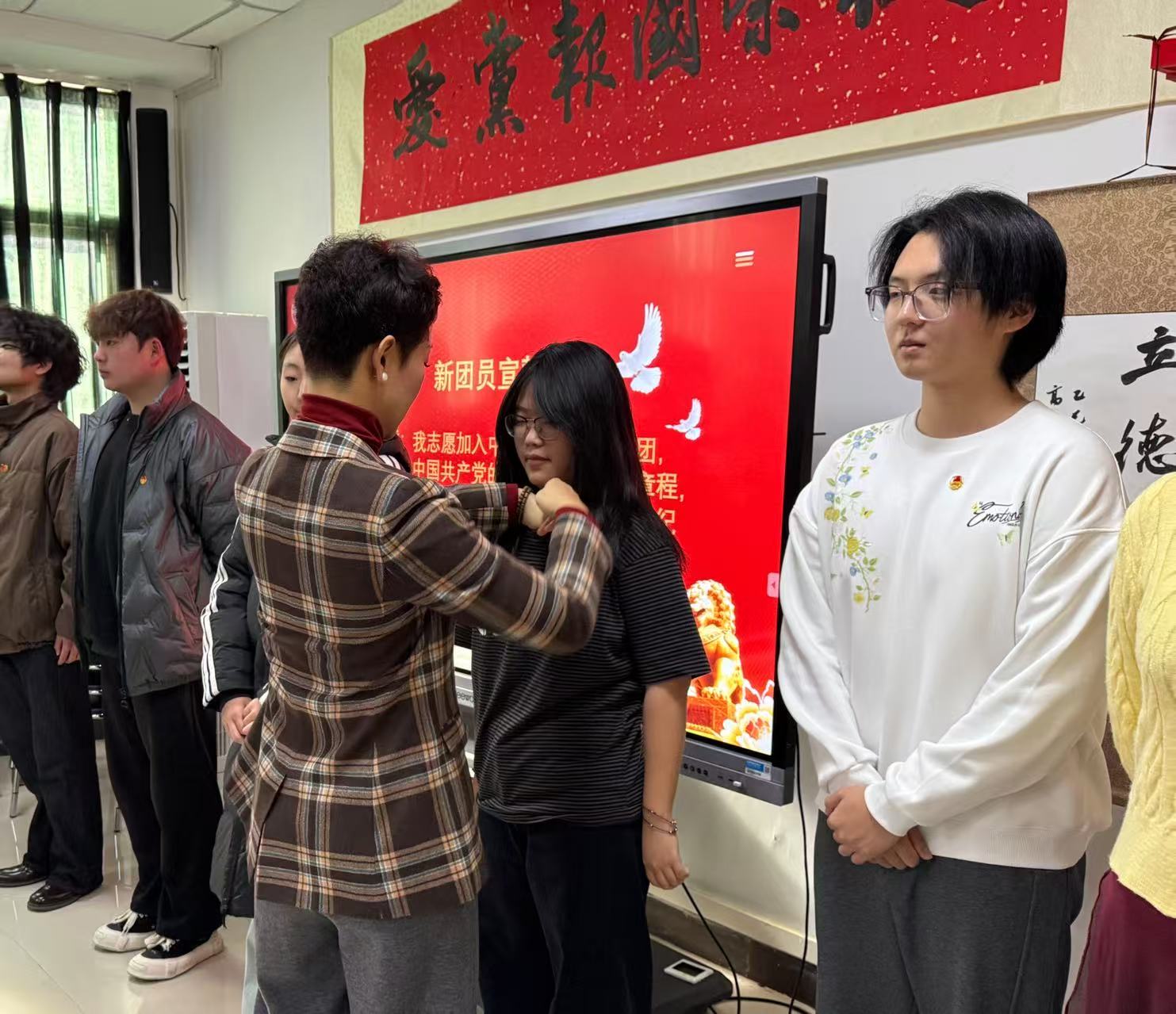 仪式在雄壮的国歌声中拉开序幕。随后,主持人宣读了新团员名单,涵盖表演、舞蹈、器乐、钢琴、声乐、学前教育等多个专业。祁姗姗、张洁为新团员代表佩戴团徽,熠熠生辉的团徽象征着责任与使命,让新团员们深切感受到团员身份的光荣。