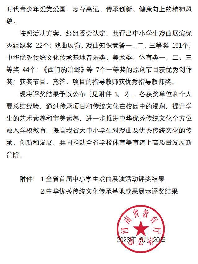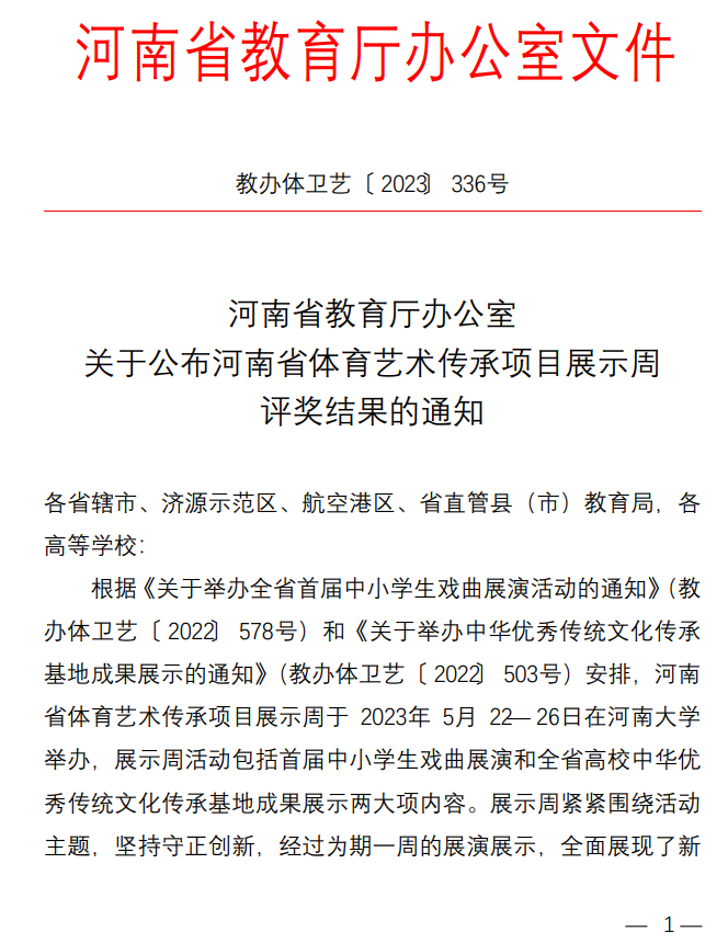 附:河南省教育厅办公室关于公布河南省体育艺术传承项目展示周评奖结果的通知截图