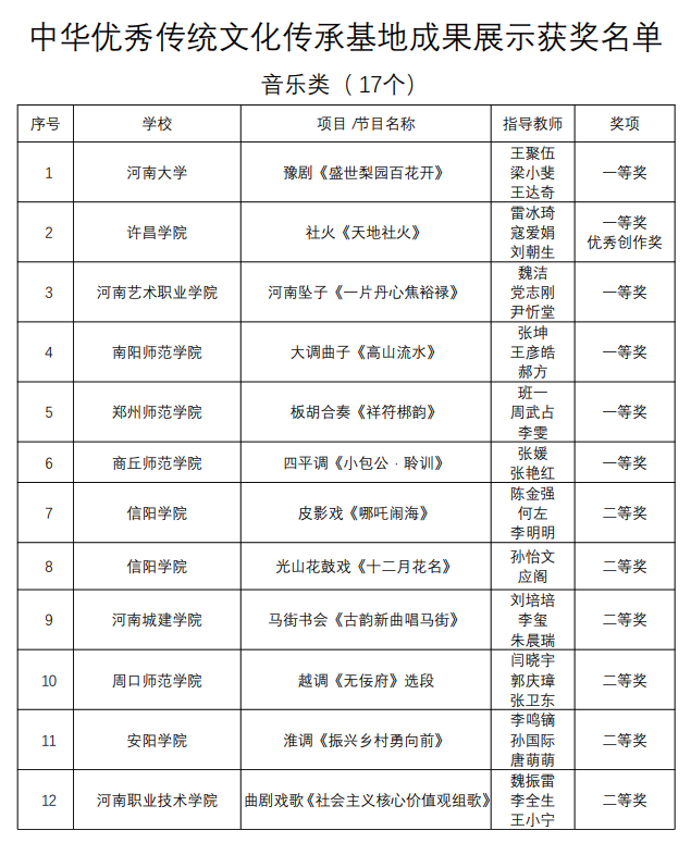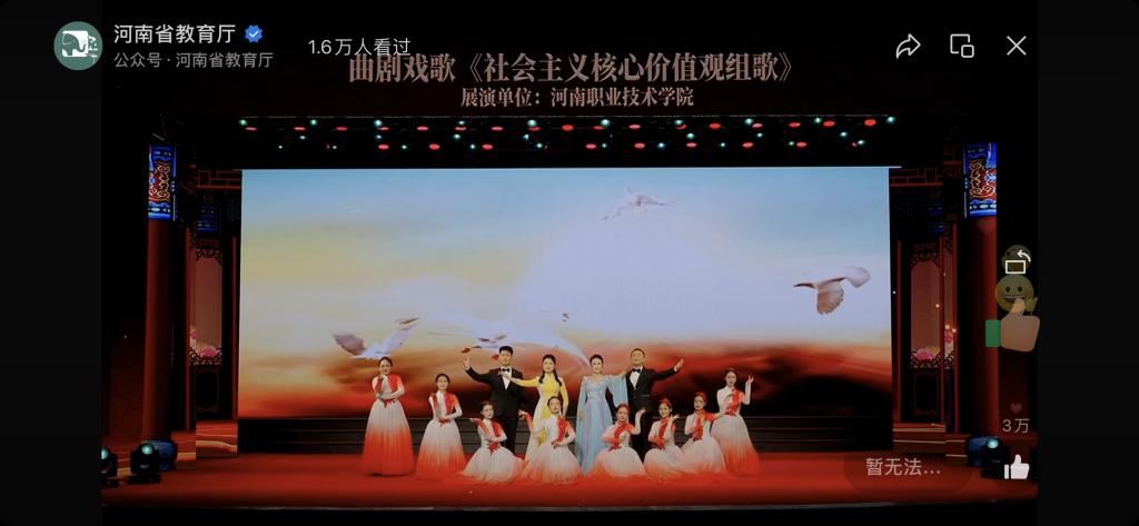 近日,河南省教育厅办公室关于公布河南省体育艺术传承项目展示周评奖结果,2023年5月22—26日在河南大学承办的河南省体育艺术传承项目展示周活动包括首届中小员工戏曲展演和全省高校中华优秀传统文化传承基地成果展示两大项内容。展示周紧紧围绕活动主题,坚持守正创新,经过为期一周的展演展示,全面展现了新时代青少年爱党爱国、志存高远、传承创新、健康向上的精神风貌。 按照活动方案,经组委会认定,共评出中小员工戏曲展演优秀组织奖 22个;戏曲展演、戏曲知识竞答一、二、三等奖 191个; 中华优秀传统文化传承基地音乐类、美术类、体育类一、二、三 等奖 44个;《西门豹治邺》等 7个一等奖的原创节目获优秀创作奖;获奖节目、竞答、项目的指导教师获优秀指导教师奖。经过激烈角逐,公司yL23411永利集团官网(公共艺术教学部)魏振雷、王小宁老师带领师生团队原创曲剧戏歌《社会主义核心价值观组歌》在音乐类中华优秀传统文化传承基地成果展示中获二等奖的好成绩。