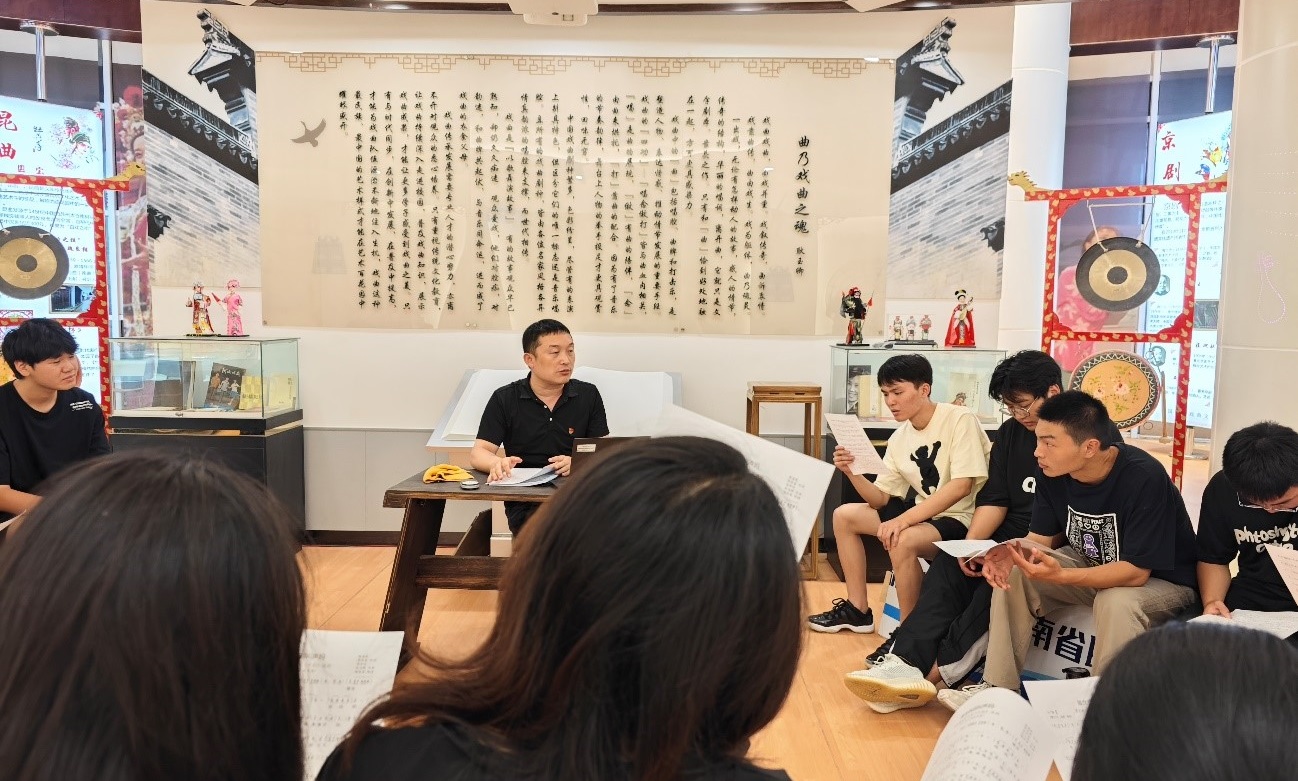 图2 魏振雷老师在戏曲音乐文化的校园传播展览馆带领社团成员学唱经典作品