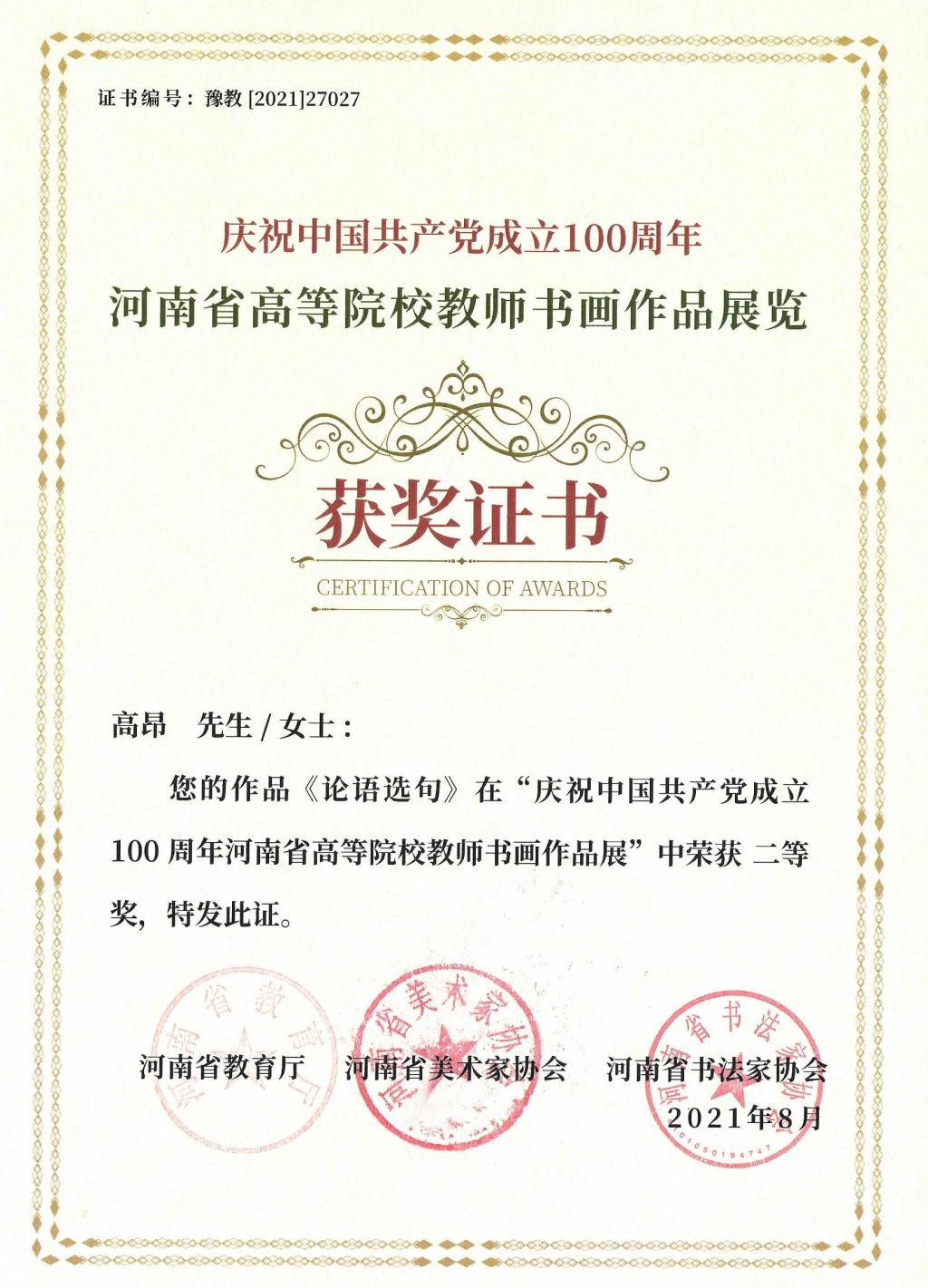 近日,河南省教育厅发文公示了庆祝中国共产党成立100周年河南省高等院校教师书画作品展览评审结果,公司教师高昂荣获书法类二等奖,年小娈荣获书法类三等奖。