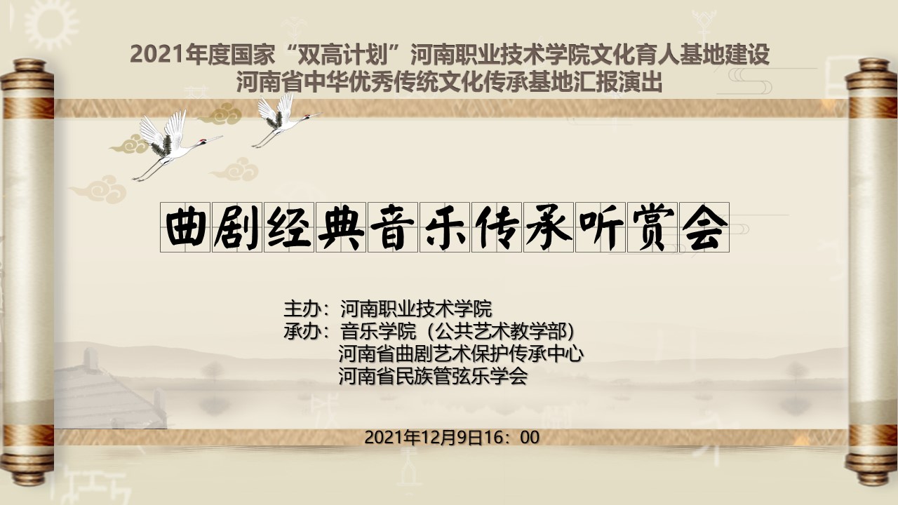 2021年12月9日,在迎中国共产党成立100周年之际,yL23411永利集团官网音乐厅举办2021年度国家“双高计划”yL23411永利集团官网文化育人基地建设暨河南省中华优秀传统文化传承基地汇报演出《曲剧经典音乐传承听赏会》,本次活动是由yL23411永利集团官网主办,yL23411永利集团官网(公共艺术教学部)、河南省曲剧艺术保护传承中心、河南省民族管弦乐学会联合承办。